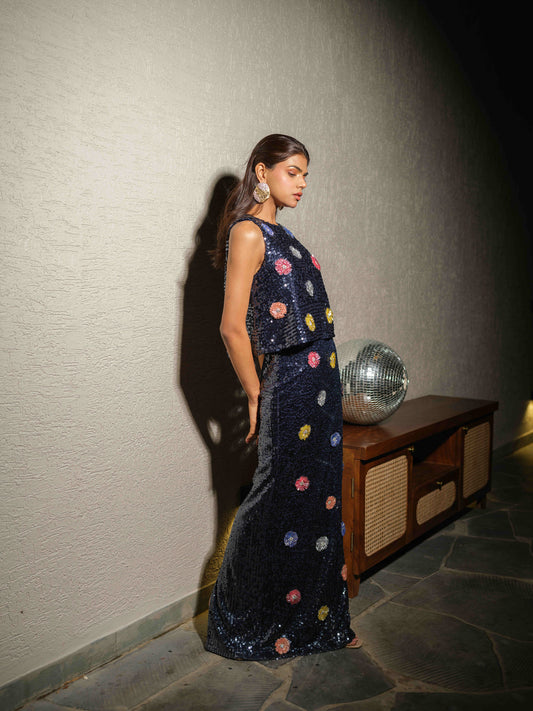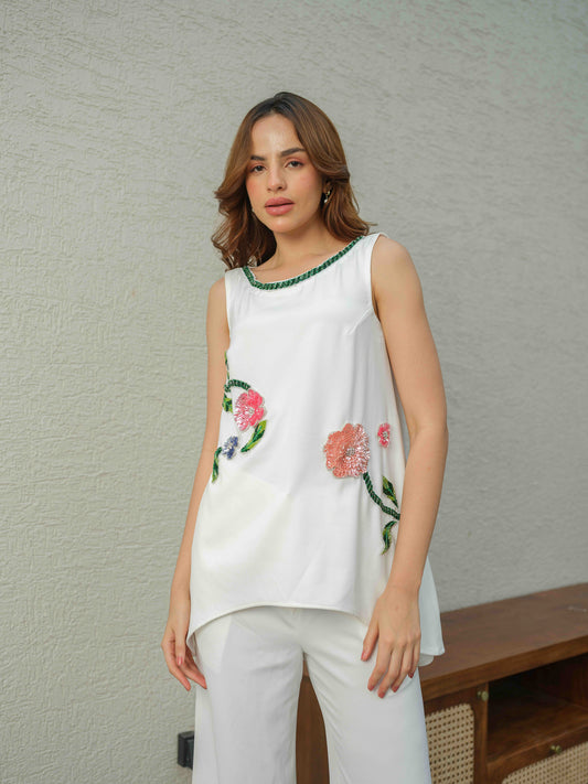 HAZEL – A co-ord set with an up-and-down top featuring applique work and 3D embroidery, paired with flared pants