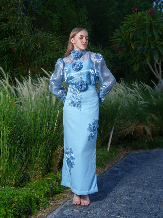 Elise - Co-ord set with Halter neck top with 3D flower detailing and tea length skirt