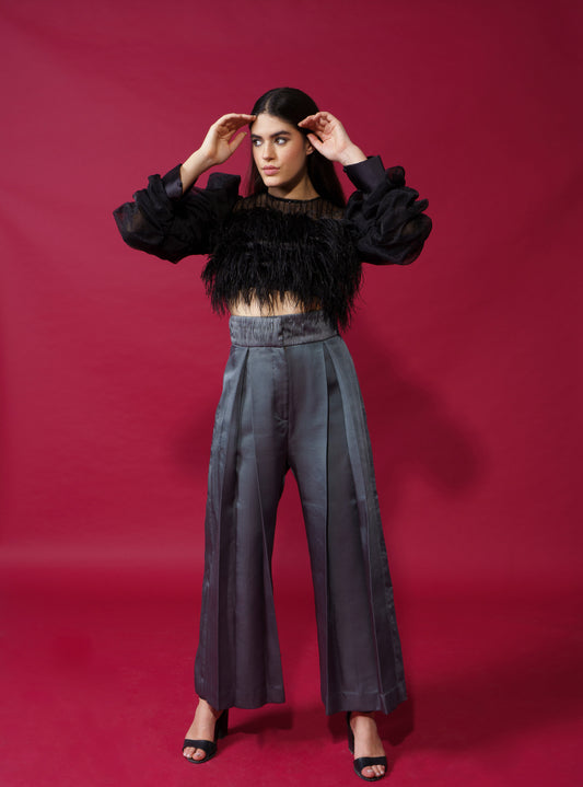 Irene - Co-ord set with feather detailed top and pleated pants.