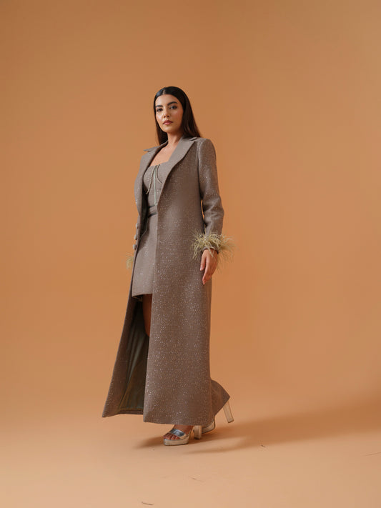 Quinn - 3-piece co-ord set, with pleated bustier and feather detailed blazer.