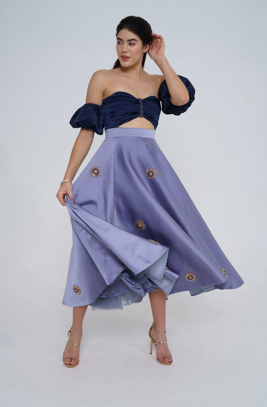 Deviya in Dove - Co-ord set with Tea length skirt and Ostrich feather bustier