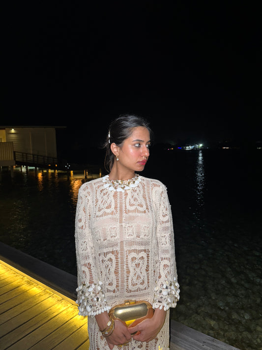 CASPIAN – A crochet dress adorned with intricate embroidery featuring Kodi shell detailing