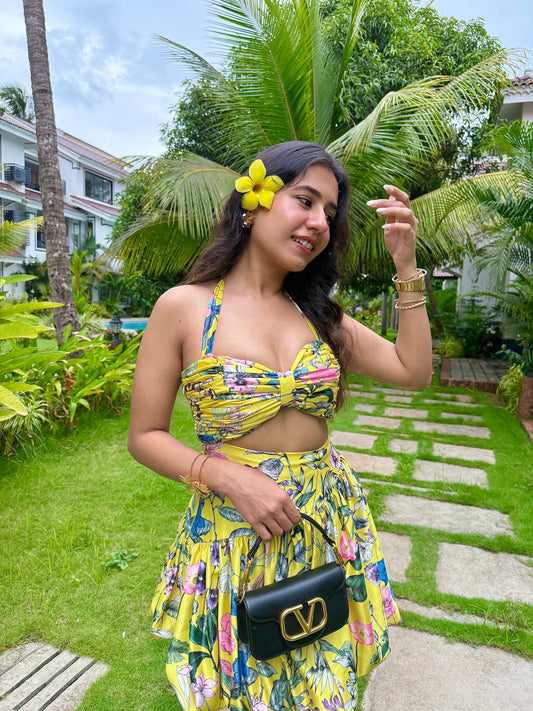 GYPSY -Short yellow printed dress with pleated bustier , flared hem