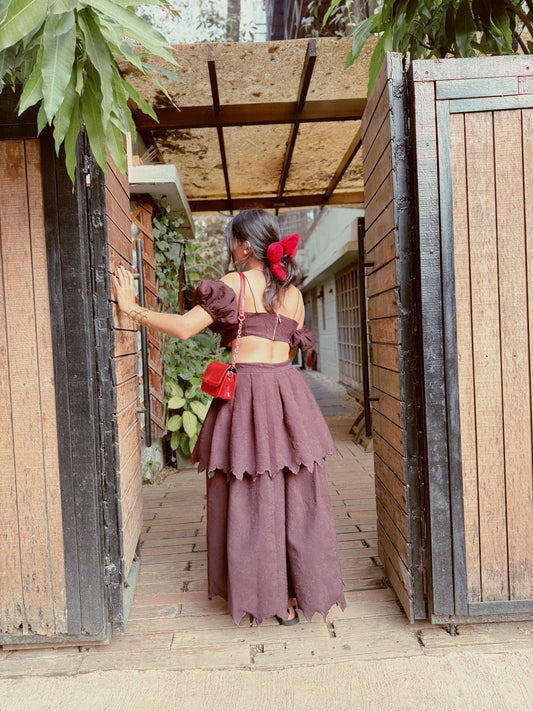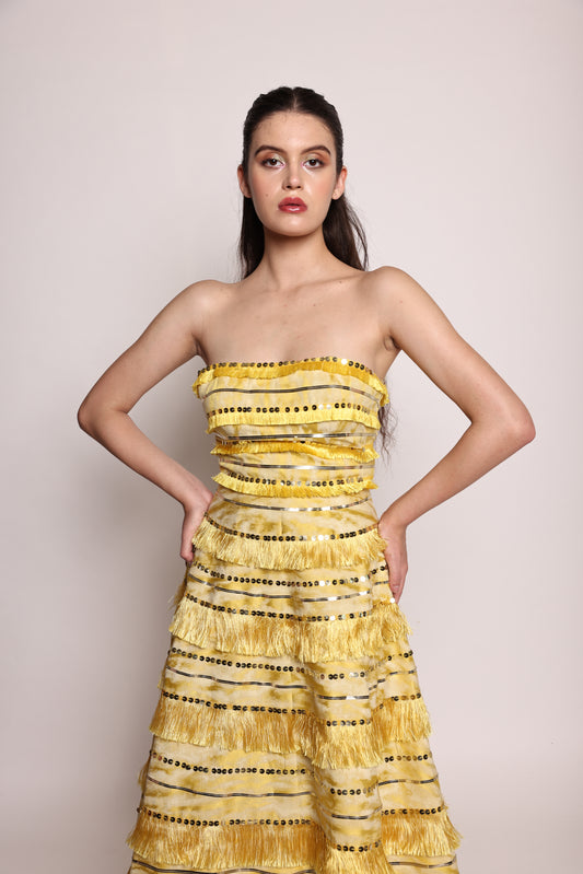STARRY – A corset necktie top with stone detailing, paired with a pre-draped skirt