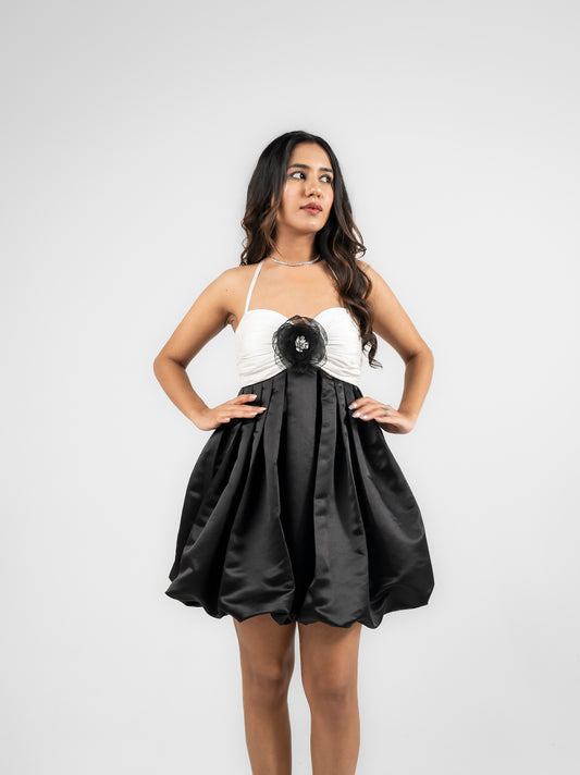 Daisy- black and white balloon dress with detachable flower