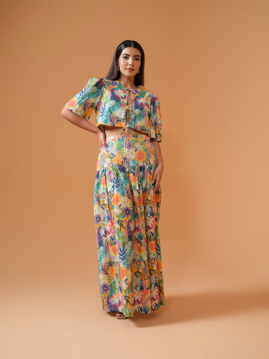 Rhea- crop front tie up jacket with drop waist skirt