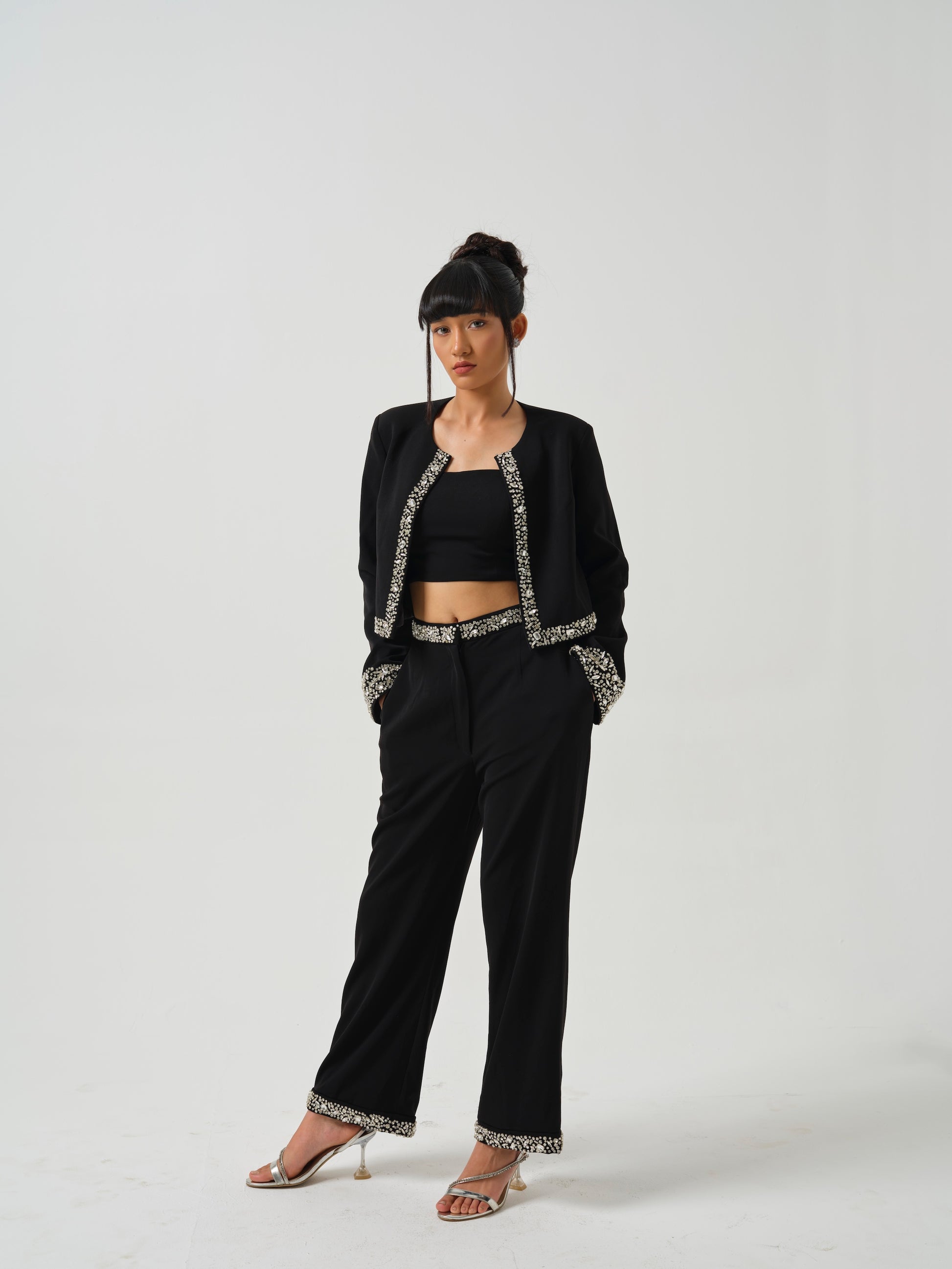 A black three-piece set featuring sleek stone detailing on the jacket and pants.