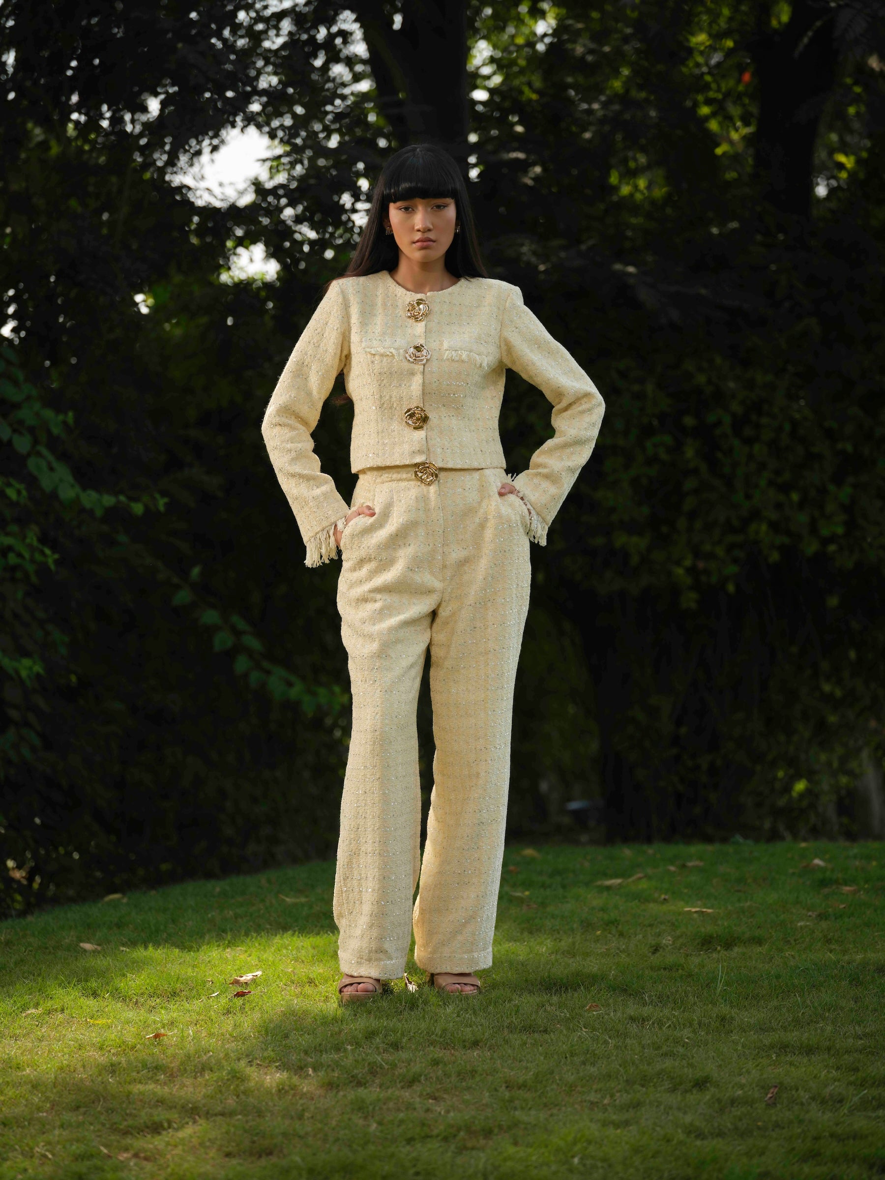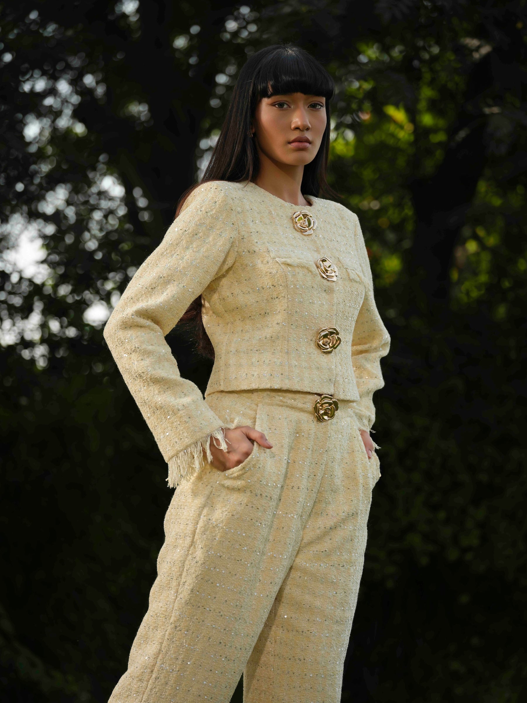 A short tweed jacket with full sleeves and delicate flower detailing, designed for a chic and polished look. It is paired with straight pants, creating a refined and effortlessly stylish ensemble.