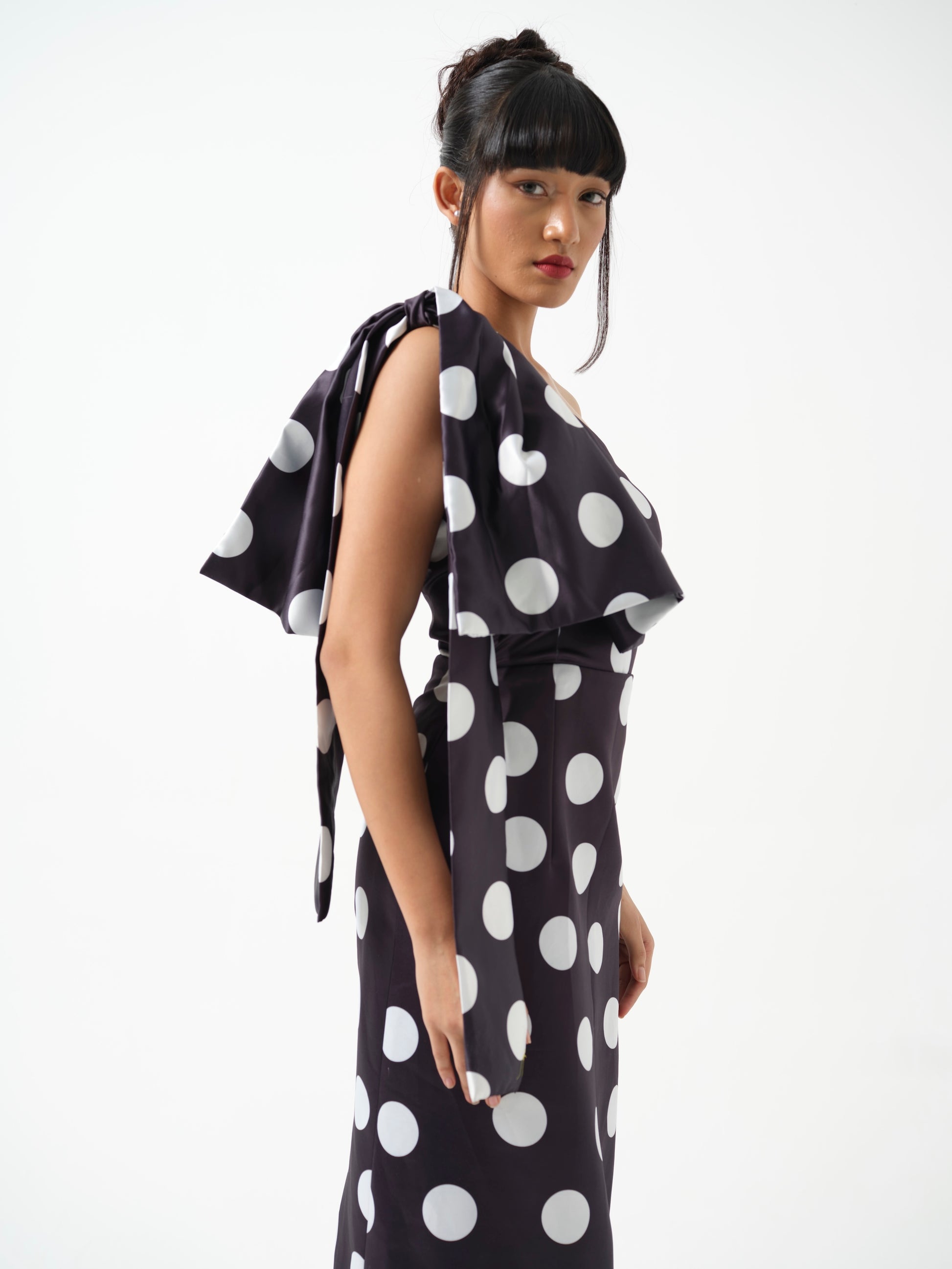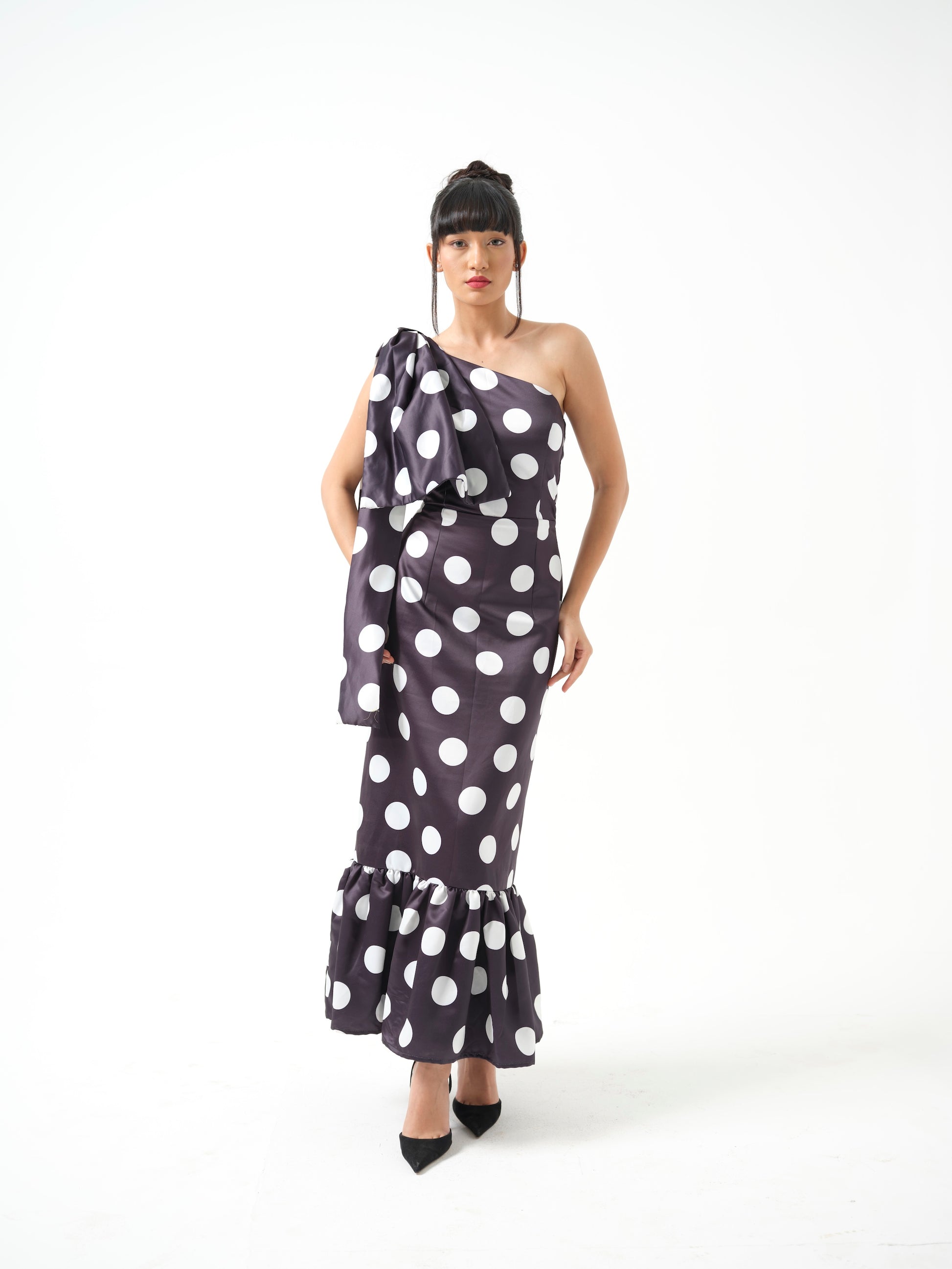 A long black, pencil-fitted polka-dot dress featuring an off-shoulder neckline with a statement bow on one side. The look is finished with delicate frill detailing at the hem, adding a graceful and modern touch.