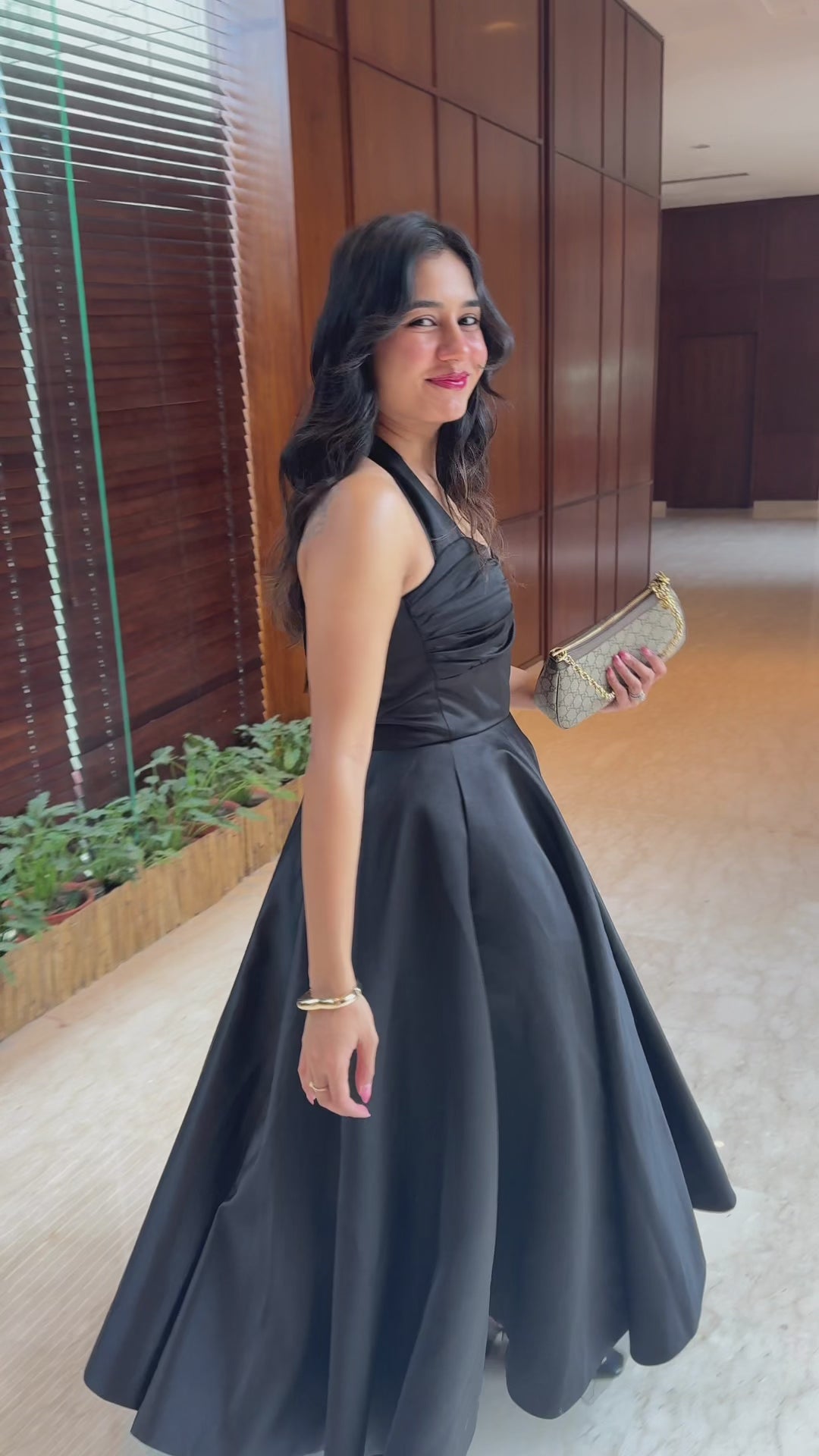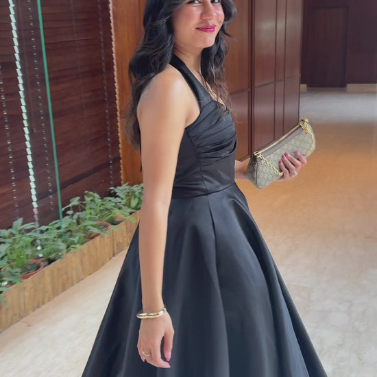 A stunning Black halter-neck tea length dress featuring intricate floral embroidery with pleated detailing on bustier.